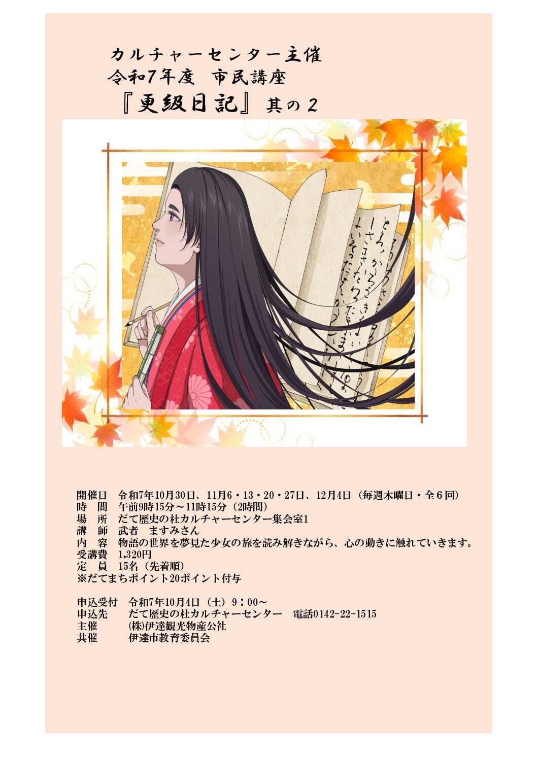 2025年10月30日・11月6・13・20・27日・12月4日(毎週木曜日)令和7年度カルチャーセンター主催 市民講座by cultureofficer場所 カルチャーセンター 集会室1 受講料 1,320円